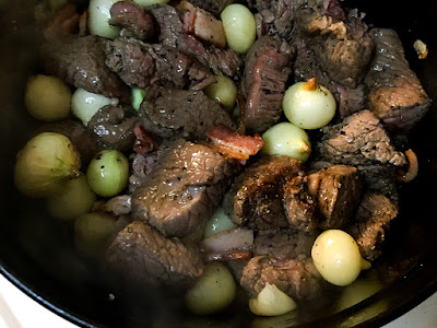Beef Bourguignon. Test run. The onions are delicious. More next time, and a more aggressive sear on the beef. Pretty close. Very delicious.